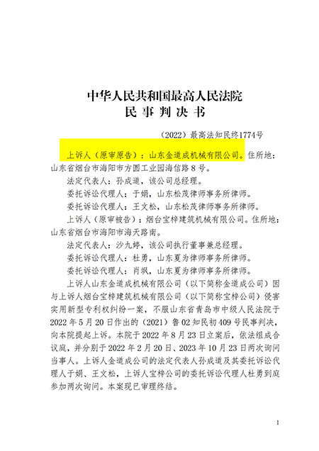 山東金道成機械有限公司于2021年11月26日立案起訴煙臺寶梓建筑機械有限公司侵犯“鍋爐爐膛檢修升降平臺”的專利權一案,經過一審、二審法院2年零11天的審查,于2023年12月07日,中華人民共和國最高人民法院做出(2022)最高法知民終1774號的終審判決: